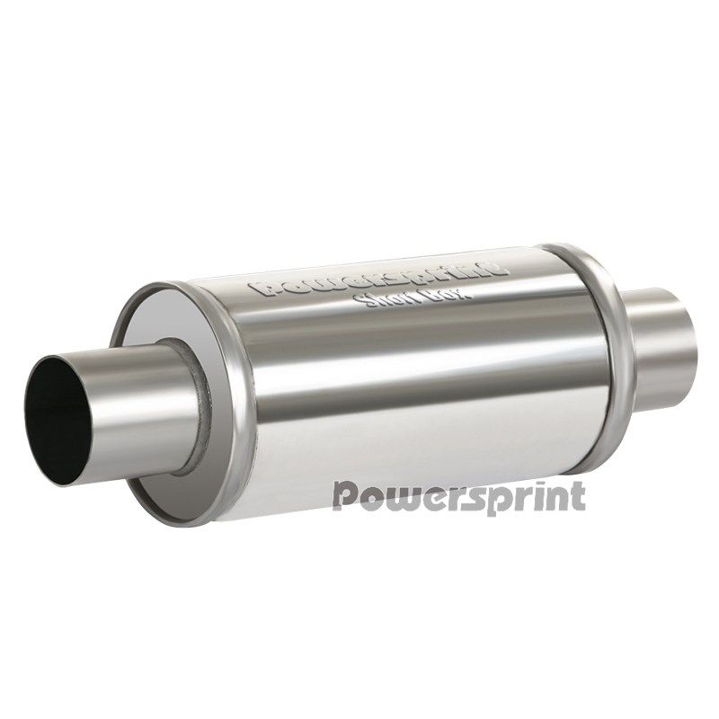 Universele roestvrijstalen geluiddemperàPOWERSPRINTà , lasbaar met roestvrijstalen buizen, buitendiameter 63,5 mm, lengte 250 mm, behuizing 125 mm