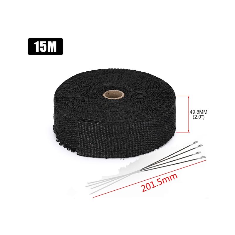 Zwarte glasvezel uitlaatisolatietape, 50 mm breed, 15 m lang, geleverd met 4 klemmen van 200 mm